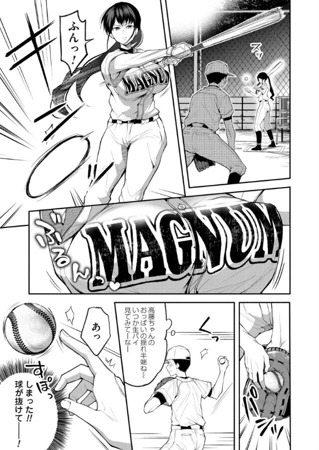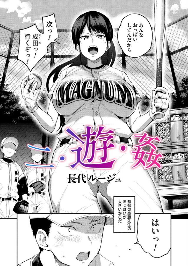 古豪の野球部で起こった先輩と女監督の不祥事。体育倉庫、白球を追いかける球児が目撃してしまった、知りたくなかった監督の秘密とは──。高藤(たかとう)監督のおっぱいはデカい。監督に直接スカウトされて入部した遊撃手の成田(なりた)が日本一を目指した厳しく辛い練習に耐えられるのも、監督の巨乳が練習中でもお構いなしに揺れるからだ。ノック中にあの爆乳に惑わされすぎてたまにミスるのも仕方なし。監督の怒声を浴びながらも、二塁手の先輩・小宮山(こみやま)のフォローで練習を乗り越える日々。「早く帰れよ?」部活終わり小宮山と帰宅中に、監督と鉢合わせる。監督と道具の整理があるから、と小宮山は成田を一人で帰らせる。しかし後輩として手伝わないわけにはいかない。成田は明かりが漏れる体育倉庫に戻った、が……。タンクトップ姿の監督が跪き小宮山のペニスを胸で包み込んでいた。小宮山があの厳しい監督にタメ口で命令している。ご奉仕パイズリ中に、愛液が溢れまくる女性器とクリトリスを足で乱暴にイジめながらパイ射。そして監督自ら部員の、生徒の生チンポを膣に求める。監督よりも頭一つは背が低い小宮山に後ろから好き勝手突かれ嬌声を上げる。絶対に無理やりではない、恍惚な表情。ずれたタンクトップから見えた乳輪にある黒子。憧れの先輩と監督の情事から、成田は目が離せない。すると窓越しに小宮山と目が合ってしまい、成田はその場から一目散に立ち去ってしまう。「後で監督の部屋に来いよ」翌日、小宮山からの誘いに成田は…?マグナムでまた新たなベールを脱いだ、長代ルージュ初の三角関係男女エロ読切40P超!!!