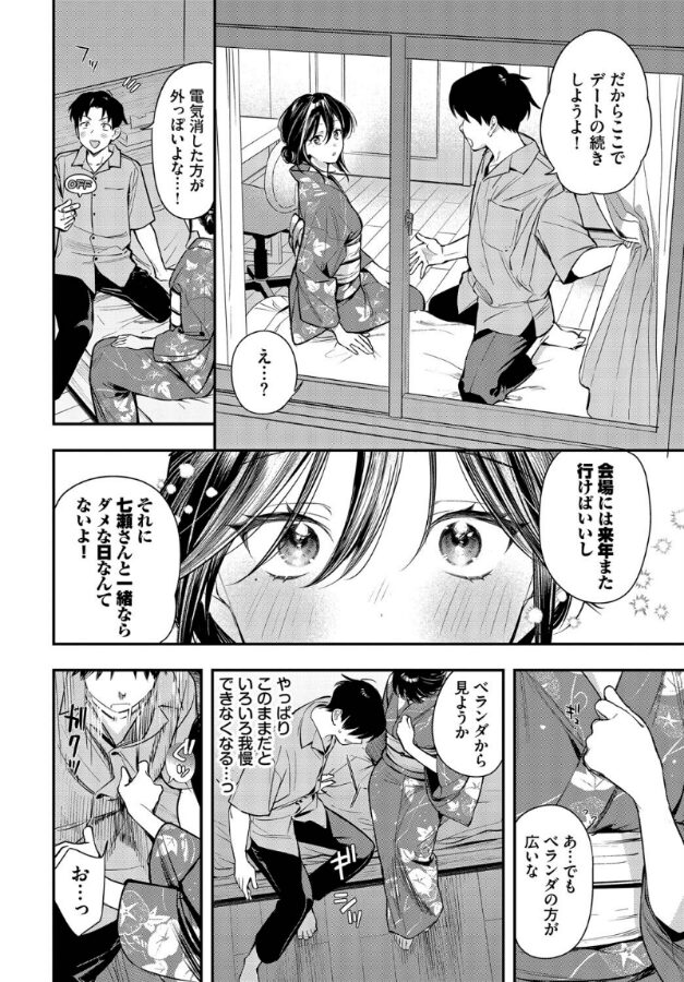 【夏祭りの最中、カノジョと二人きりの部屋で…】美麗アオハル絵師・蛸田こぬが綴る、はだける浴衣がソソる初体験エロス♪大好きな彼女・七瀬さんと夏祭りデートに来た主人公。つきあって半年、キス止まりな関係を悩んでいる中、彼女のケガにより急に自分の家に招くことに…。申し訳なさそうな七瀬さんを元気づけようと励ますと、急に彼女からキスをされて…!?ドキドキな男女が一歩踏みだす急展開に!! 浴衣姿で始まるウブなカップルの胸キュンHをぜひ♪