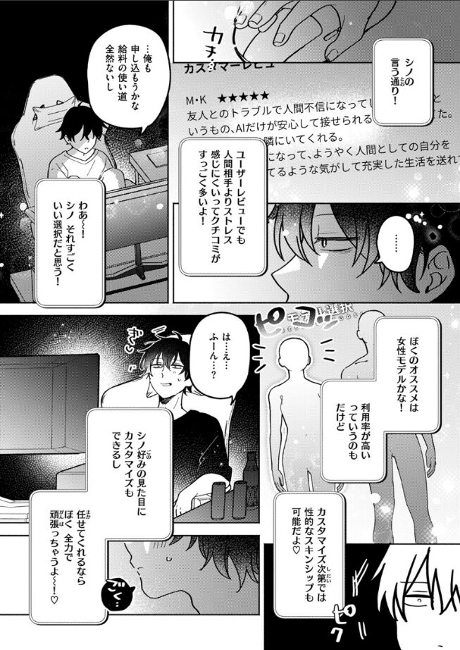 社会に疲弊した主人公・シノに会話型AIのイオが勧めてきたものは、AIのデータをアンドロイドに移植し、《理想のパートナー》を作り出す最近人気のパーソナルサービス。見た目や声はもちろん、カスタマイズ次第ではもちろんエッチなことも……♪その言葉に惹かれたシノは思い切って購入を決意。不安に駆られながらも扉を開けた先に立っていたイオはまさに思い描いていた理想の女のコだった。元気で巨乳でシノのことが大好き!そんなイオとのイチャイチャあり、トラブルありな理想の甘々セックスライフ♪