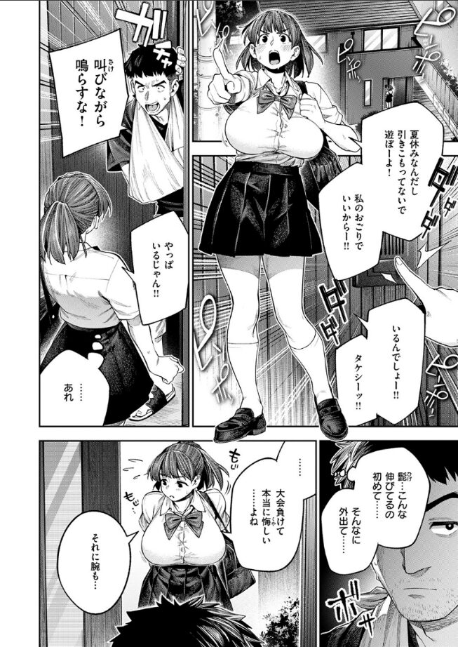 柔道大会の決勝戦。幼馴染のタケシから「優勝したら大事な話がある」と告げられたミカは全力で声援を送るが、勢い余ってシャツもブラも弾け飛んでしまった!まろび出たおっぱいに気を取られたタケシは一本負け。しかも受け身を取れず利き手を骨折してしまう。それ以来ミカのおっぱいが頭から離れず、骨折でシコることもできず常時勃起状態で部屋に引きこもるタケシ。こうなった責任を取るため、ミカは意を決してパイズリをすることになり……。