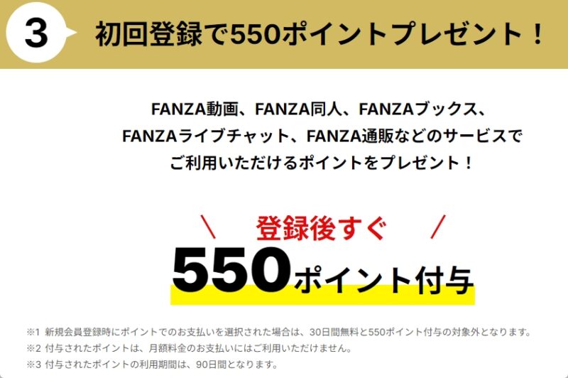 - 登録後に即配布される550円相当のDMMポイントをゲット