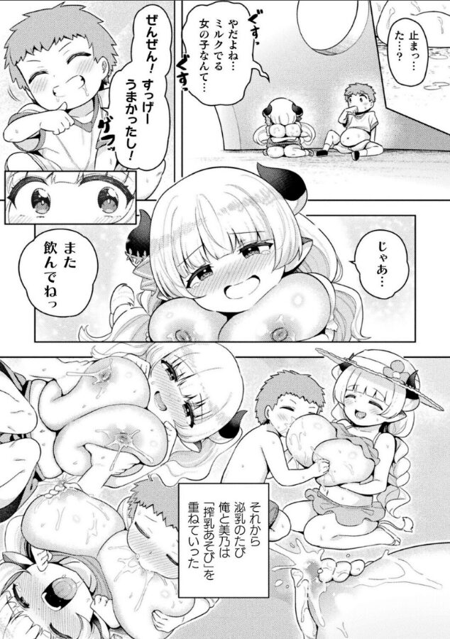 疎遠になってしまった牛娘と相思相愛搾乳H!青年、圭太は幼少期に幼馴染である牛娘の美乃の母乳を搾るという2人だけの内緒の遊びをしていた。だが、ある時を境に関係がぎこちなくなり、ついには疎遠になってしまっており、圭太は2人の思い出の詰まった公園でひとり過去を振り返る。そのとき、彼を呼ぶ微かな声がドーム状の遊具より聞こえ、美乃が彼の名を呼びつつ遊具の中で搾乳自慰に耽っている様を目撃してしまう。自慰を見られ赤面した美乃は長年の想いを圭太にぶつけつつ、恥じらいながら以前のように母乳を飲んでほしいと言う。そんな美乃の姿に歯止めがきかなくなった圭太は、彼女の母乳したたる豊満な胸にむしゃぶりつき、いきり立ったペニスを差し出すと――。※『別冊コミックアンリアル 人外幼馴染との初体験 デジタル版Vol.1』収録