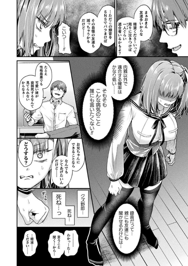 陰気な兄を毛嫌いしている梨々夏は病気を公言される弱みを握られ屈辱の中生Hを了承するが、兄とのセックスが日常化していく中で次第に治療と称し過激になっていくプレイにハマりはじめ、弄られ続ける身体は兄ちんぽを挿入される事を待ち望みだし……。