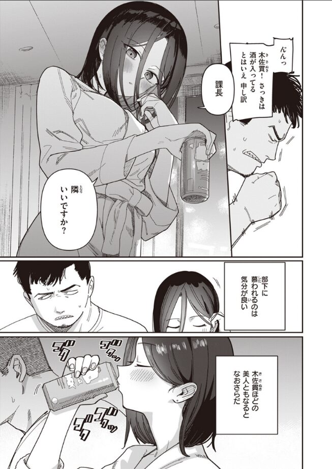 「今ならお酒のせいにできますよ」いい感じにできあがった会社の飲み会帰り。強面だがコンプラ意識が強く優しい課長は部下に付き合うことを無理強いせず、ひとりで飲み直そうとしていたが、そこに美人部下・木佐貫(きさぬき)さんが「このあと一杯付き合ってください」と声をかけてきた。どう見ても課長をオトそうとしている木佐貫さんと、過剰にハラスメントを気にして奥手な課長。そんな二人のサシ飲み二次会がいま始まる……!!