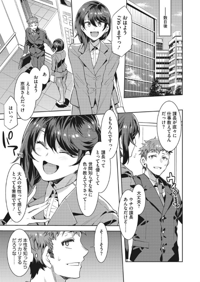 新たに配属された若手女性を、課長が直々に指導することになった。課長の槍間さんと名前を聞いただけで、男性スタッフは背筋が寒くなる。さっそく新人と男性が資料室に呼ばれ、仕事の内容よりもコミュニケーションの大切さを教わるのだった。股間をまさぐり、咥え込む課長に合わせ、変態衣装を身につけた新人は勉強になります…と応じ、フェラをこなし、ヤリマン好色な課長を見習ってハメ漬け勤務に励むのだった。