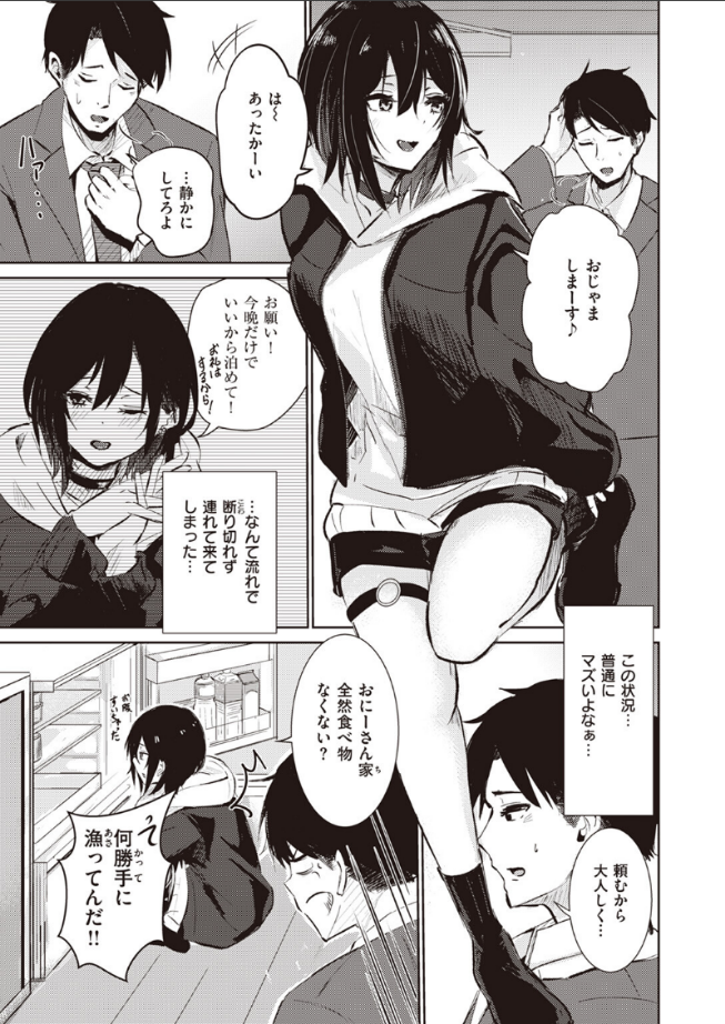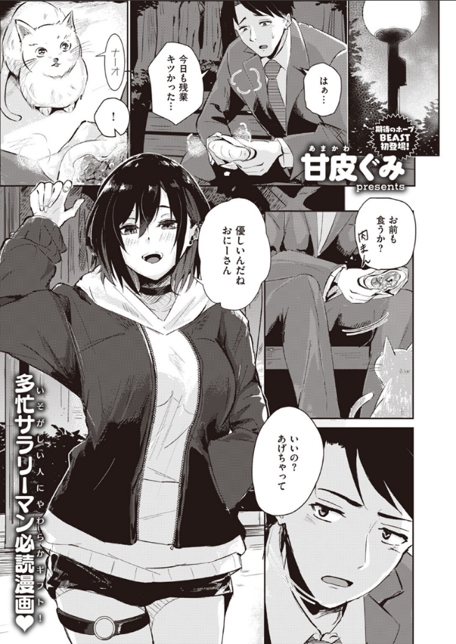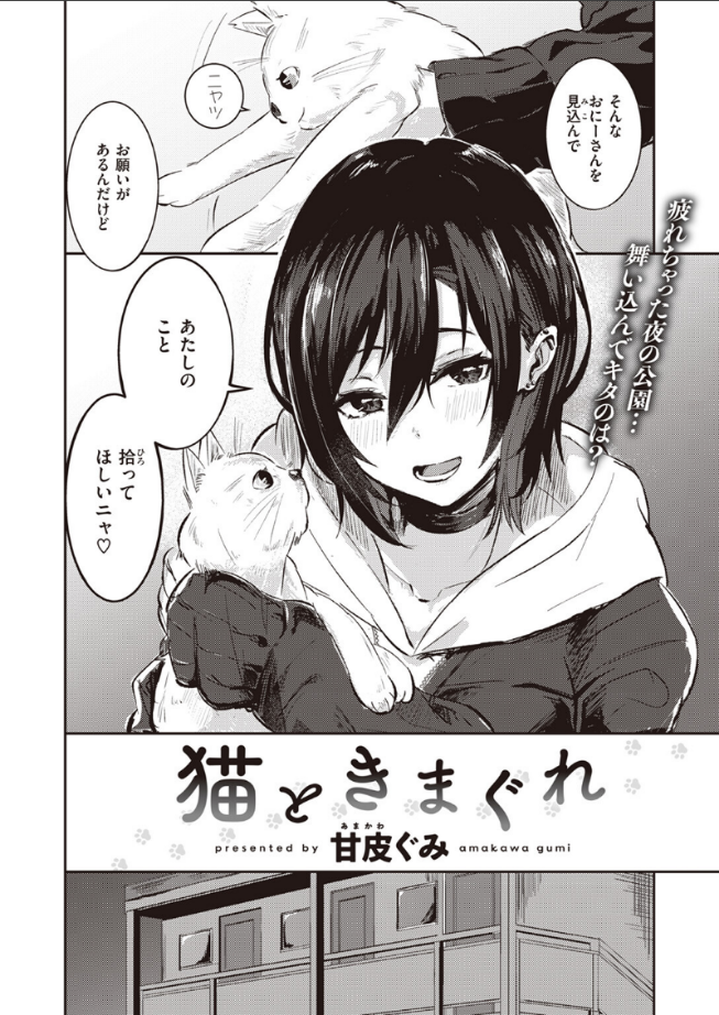 「あたしのこと…拾ってほしいニャ」残業に疲れ、夜の公園で肉まんをかじるサラリーマンの前に現れた女のコ。どうやらワケありの家出少女のようで……。部屋に来てからも女のコのペースで流される男だが……。