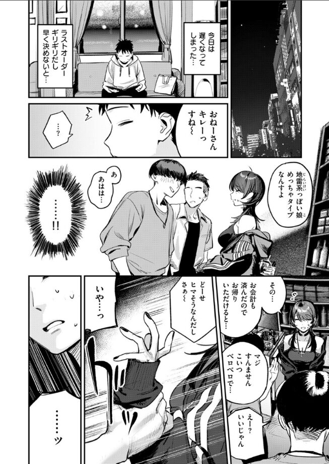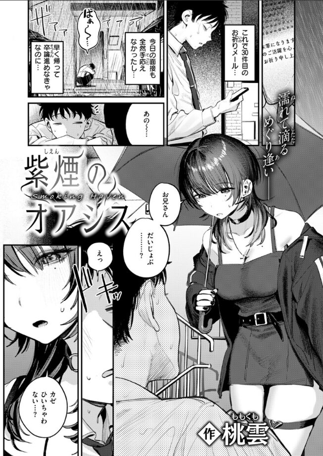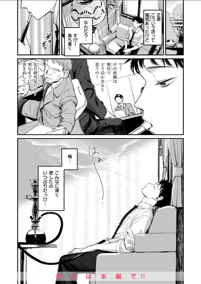 「スモーキングキス…頭ぼ〜っとして気持ちーでしょ」就活に卒論……何も上手く行かない日々。面接の帰り道、大雨の中で項垂れていると、ピアスバチバチのサブカル系お姉さん・カナに声をかけられ、彼女が経営しているというシーシャバーで雨宿りをすることに。店内に招かれ、初めてのシーシャ体験に癒された俺は、定期的に店に通うようになる。ある日、店で客に絡まれているカナさんを助けると、この後時間があるかどうか聞かれ……。そして閉店後、2人きりの店内。フレーバーの味見をしてほしいとキスをされ、そのままピアスのついた舌でフェラしてくれて……。
