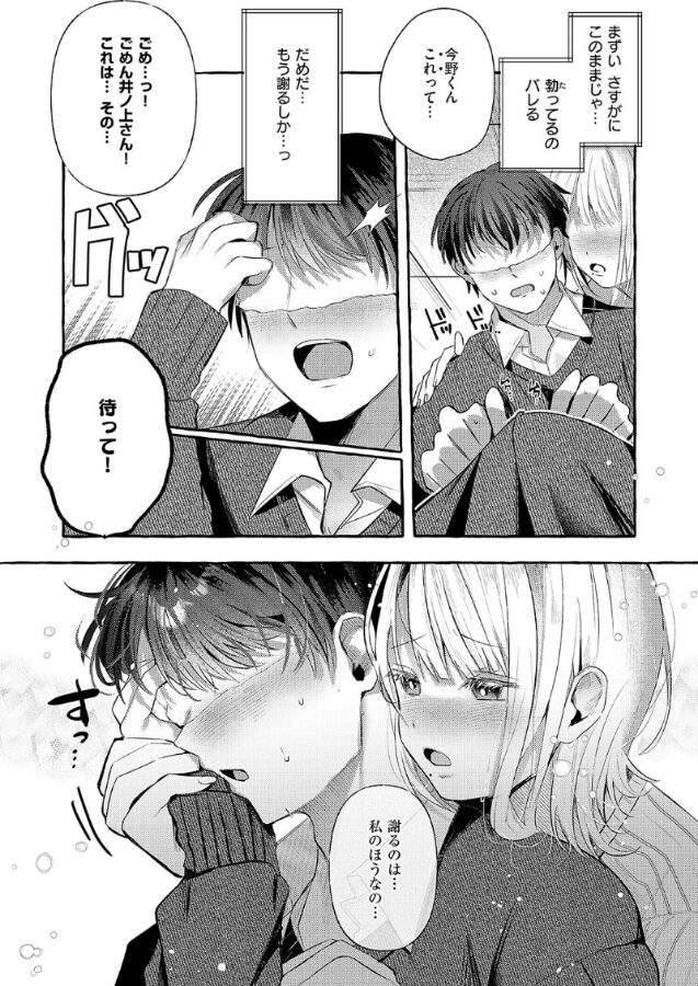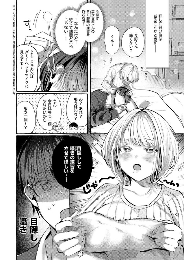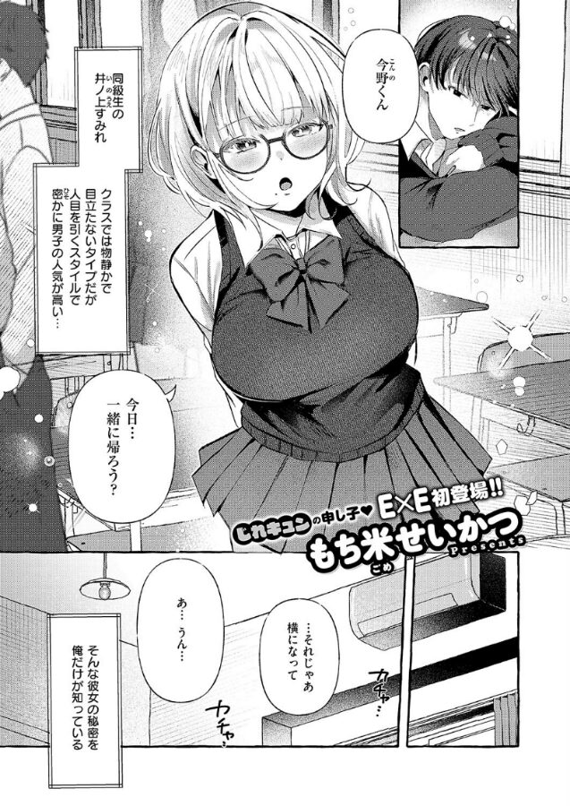 クラスメイトの井上さんが、ASMRの動画投稿者だと気づいた今野。決心して本人に話しかけてみると、まさかの意気投合し動画撮影の秘密の練習相手になることに!勃起しないよう冷静を装う今野だが、練習中に井上さんの甘い囁きでついにアソコが反応してしまい…!?じれキュンの申し子♪ もち米せいかつ先生がフェチ度マン点巨乳JKでE×E初登場!