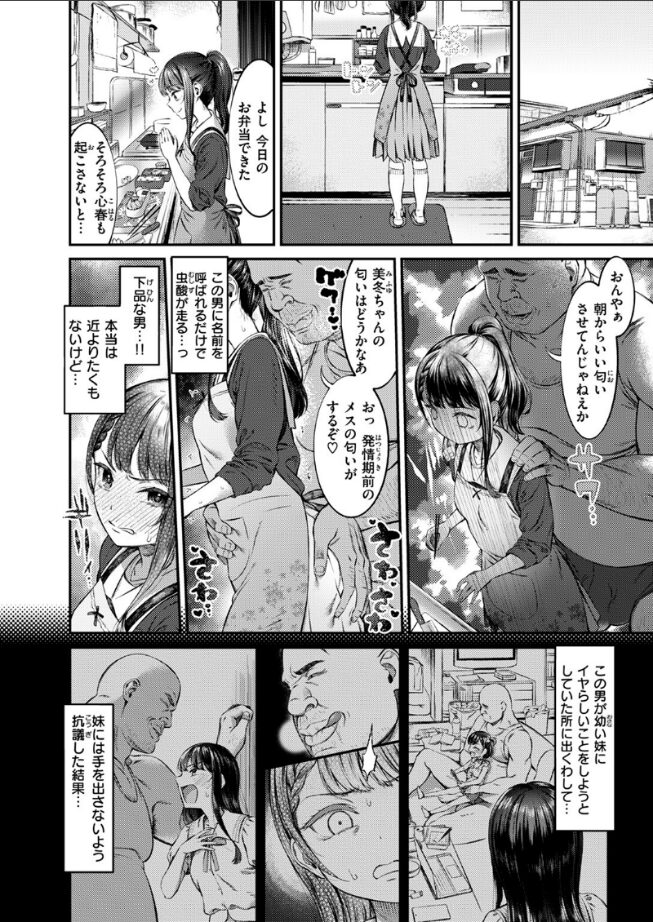 (妹のために…私が耐えなきゃ…)両親を事故で亡くし、叔父を名乗る男に引き取られた美冬(みふゆ)と心春(こはる)の姉妹。下品で不潔な叔父から妹を守るため美冬はセクハラに耐え続けるが、ついに無理やり処女を奪われてしまう。しかもそれを心春に目撃され美冬は気を失うが、目を覚ますとそこには楽しげに腰を振る妹がいて……?