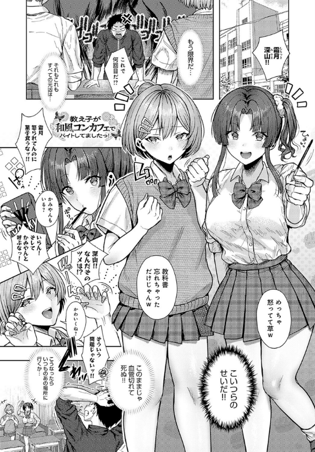 「お帰りなさいませ〜♪ ご主人様〜♪」……って、なんでお前らがここに!? 俺は、担任クラスの美少女問題児・霜月と深山に頭を悩ませていた。疲れを癒そうと和風コンカフェに来ると、そこにはストレスの元凶・霜月と深山が働いていて──!? うちの学校はバイト禁止。校則違反を見過ごせない! 指導を試みると…… 「こうなったら… ホテル行こ♪」 と、誘われてしまった!! 彼女たちに流されホテルに向かい、和服姿の美少女JKのおっぱいに挟まれてしまったら、相手が教え子だろうと我慢できない☆「ご主人様…っ 挿れて下さいませ…♪」 煽ってくるイケナイ生徒たちに、生挿入で徹底指導!!!!ハッピーセックスの伝道師・旅口工路先生が贈る、トラブルメーカーな教え子JKたちと癒されいやらし3Pえっち♪