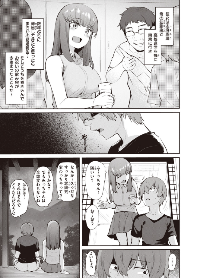 「本当はみっちゃんの事好きだったんだよ」幼馴染の瑠璃(るり)が数年ぶりに田舎に帰ってきたと思ったら、まさかの結婚報告だった。お祝いの飲み会が盛り上がっている中、縁側で黄昏ている俺に好きだったと告白してくる瑠璃。今更の出来事にショックを受けた俺が部屋で寝ていると、横には瑠璃がいて……。おっぱいを触っても起きない無防備な幼馴染の姿に想いは止められず、禁断の中出しSEXへ!!