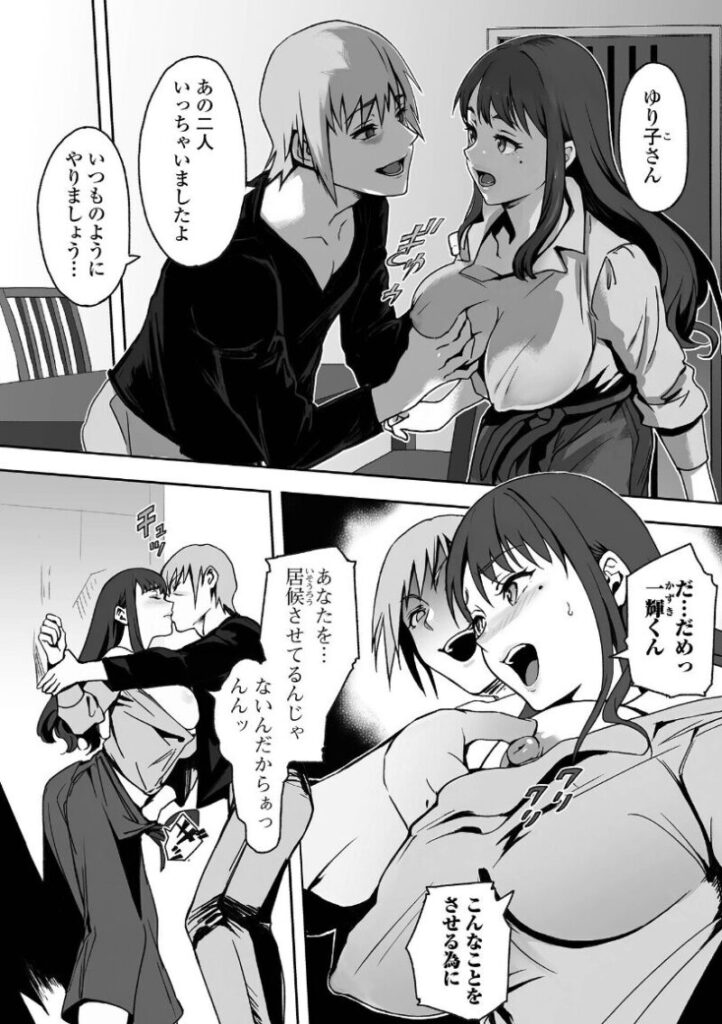 朝、いつものように元気よく夫と娘を送り出す美巨乳の奥さん、ゆり子。その姿を獲物を狙う野獣のような目つきで眺める娘の幼馴染かつ、居候の一樹(かずき)。ふたりきりになると途端、ゆり子の弾力で揉み心地のいい豊乳を鷲掴みに…!!◆性欲処理が出来なきゃ娘の方に手を出すと言われ、なし崩しにそのまま身体の関係に。それからは家族が外出しているタイミングで、昼夜を問わず一樹の精が尽きるまで交わる。やがて仕方なしのセックスだったゆり子は自ら愛欲の虜になり、男を求め始めて…!?※この作品は「コミック刺激的SQUIRT!! Vol.58」に収録されている作品の単話配信です。