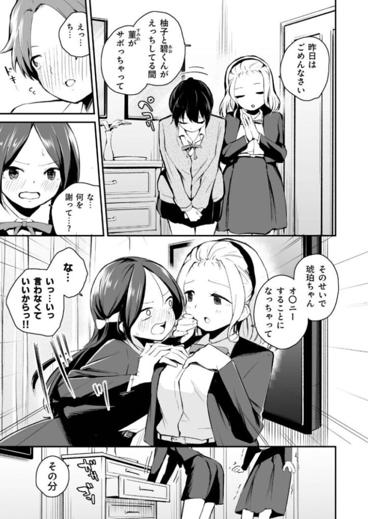 『あたしだって…気持ちよくなりたいし』昨日あった事が頭から離れず上手く話せない碧と琥珀。そんな2人を見て柚子がまた良からぬことを企てる。「昨日はごめんなさい」「その分…今日は琥珀に色々としてあげる!」碧と琥珀はまたまたエッチな策略にハマっていく…
