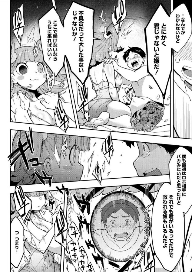 ☆セクサロイド(♀)×人間(♂)風俗嬢を勤める、量産型セクサロイド「ロボ子」に恋をしてしまったリク。しかしロボ子は最近不具合が発生したため、廃棄が決まっていた。彼女の最後のお勤めの日、リクがついにロボ子に思いの丈を告げてキスをすると……なんと、ロボ子の隠された機能「感覚機能センサー」が発動! 触れるとまるで人間のように反応し、感情を理解したロボ子は、自分の不具合がリクへの恋心から生まれていた事を自覚した。そして、これまで何度も行ってきた仕事としてのSEXとは違い、初めて自分の意志でリクとのHを望むのだった。