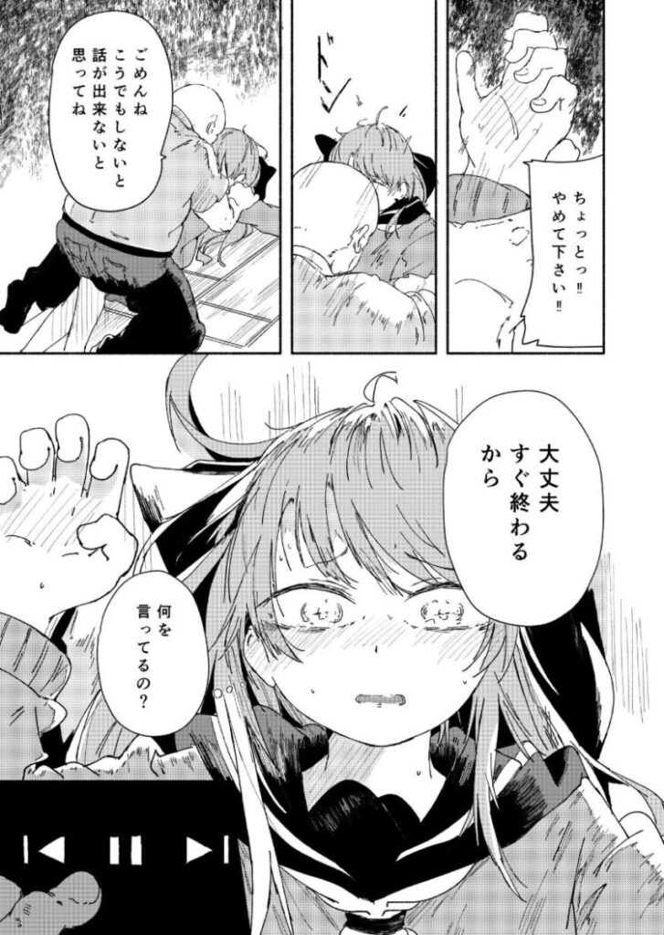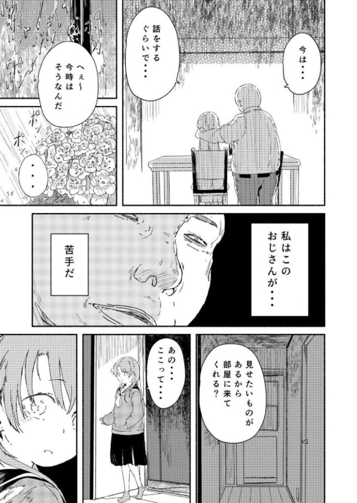 大好きな彼氏は叔父と2人暮らしをしている。おじさんは彼の生活や学費をお世話している立派な人でも【私はこのおじさんが…苦手だ】普段から妙な視線や彼氏との関係に対して答えづらい質問、それにボディタッチがあり、どこか気持ち悪さを感じていた。私が過剰になっているだけなのかな…ある日彼氏の家で留守番をしているとおじさんからいつもの怖い視線や答えづらい質問を投げかけてきて見せたいものがあると奥の部屋に招かれた。そこで見たのは、壁や天井一面に≪性行為の写真≫が貼られた部屋だった。立ちすくんでしまった私に彼氏の叔父さんは……