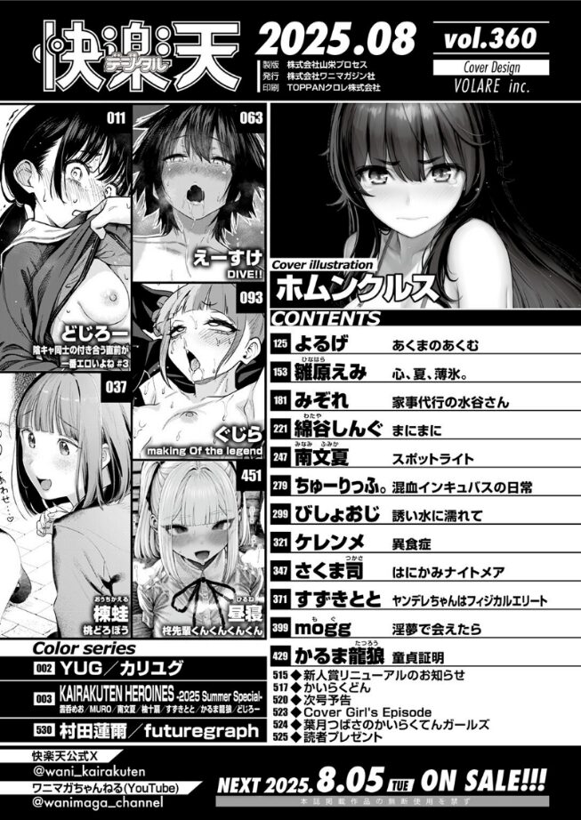 - 作者 : ホムンクルス YUG 雲呑めお MURO かるま龍狼 村田蓮爾 mogg ぐじら 雛原えみ えーすけ 楝蛙 さくま司 ちゅーりっふ。 すずきとと 昼寝 柚十扇 南文夏 みぞれ どじろー よるげ ケレンメ 綿谷しんぐ びしょおじ