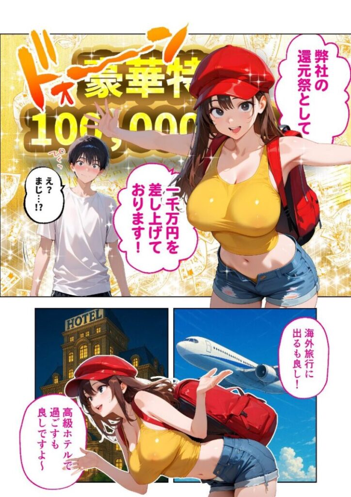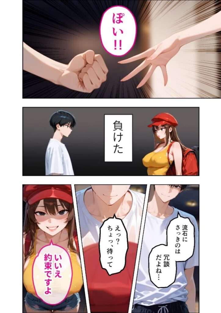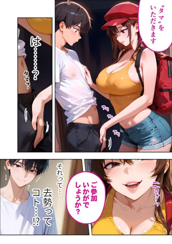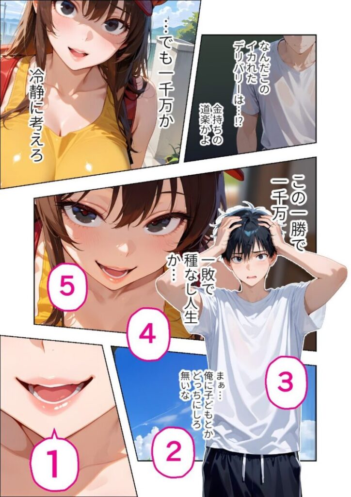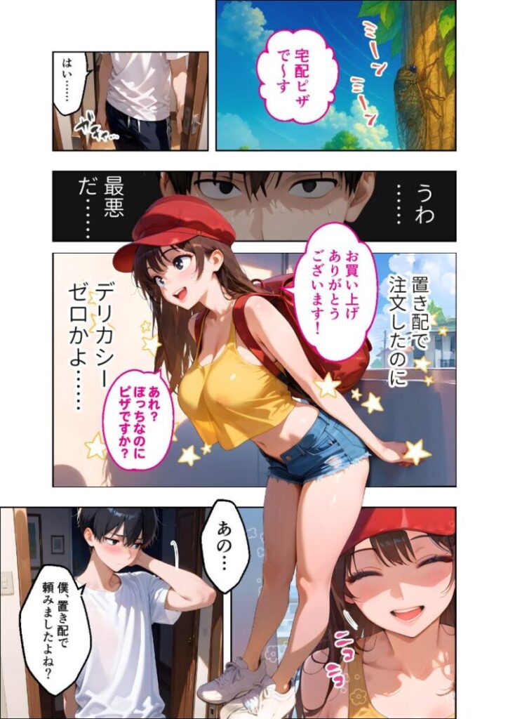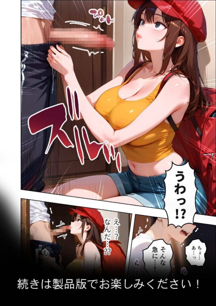 「注文ありがとうございます!あれ、ぼっちなのにピザですか?」あぁ…最悪だ……置き配で頼んだのに、こんなにもデリカシーのない配達員が来るなんて。それはある夏の昼下がり。いつものように宅配ピザを頼んだ俺の家に訪れたのは、やけにエロい配達員・マイカだった。彼女が言うに、ただいま会社の還元祭で特別なキャンペーンを行っているらしい。配達員とじゃんけんをし、勝てば一攫千金。けれど負ければ’タマ’をいただかれる……大金か去勢か悩んだ末、そのキャンペーンに参加した俺は、あえなくじゃんけんに負けてしまった。「流石にさっきのは冗談だよね…」「いいえ、約束ですよ」「えっ…ちょ、うわっ…!」「あはっ、それじゃあ……」「お客様の’タマ’、イタダキマス♪」待って、’タマ’をいただくってそういうこと――!?本編44P+AIイラスト5P収録!【注意事項】※本作品のシチュエーションは全てフィクションです。登場する人物や設定等は、すべて架空のものとなります。※この作品内に登場するキャラクターは全員20歳以上です。※本作品はStable Diffusionを使用して制作しております。※犯罪、その他違法行為を美化または助長する意図はございません。